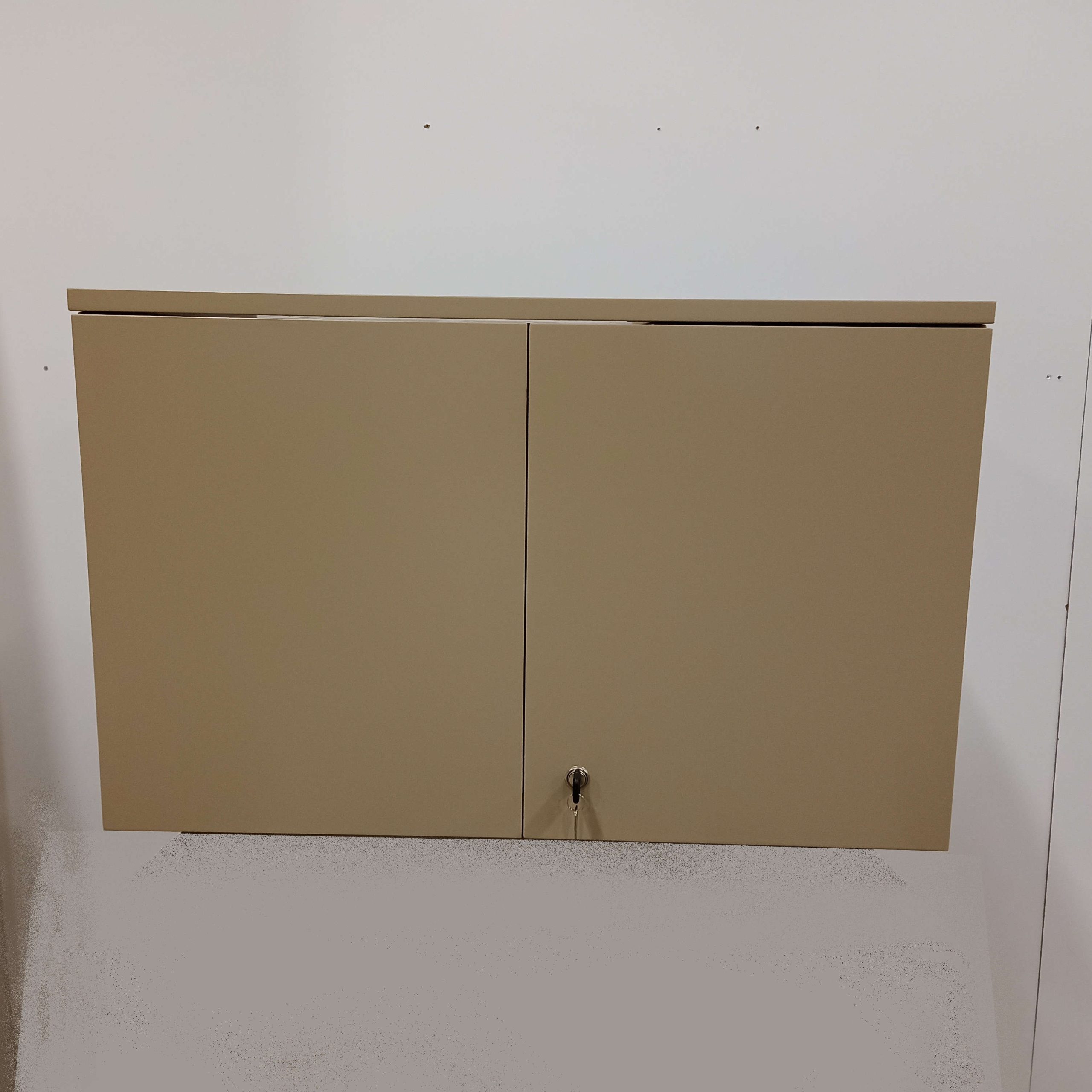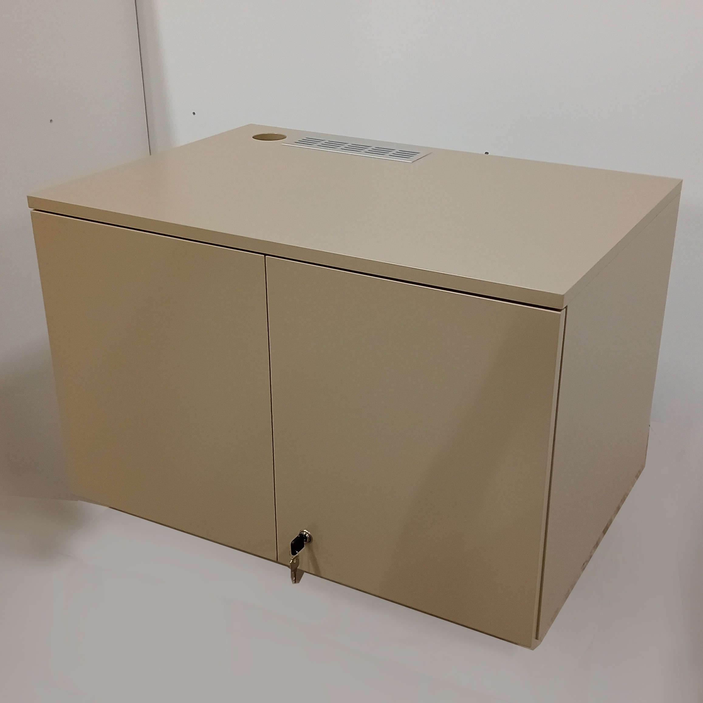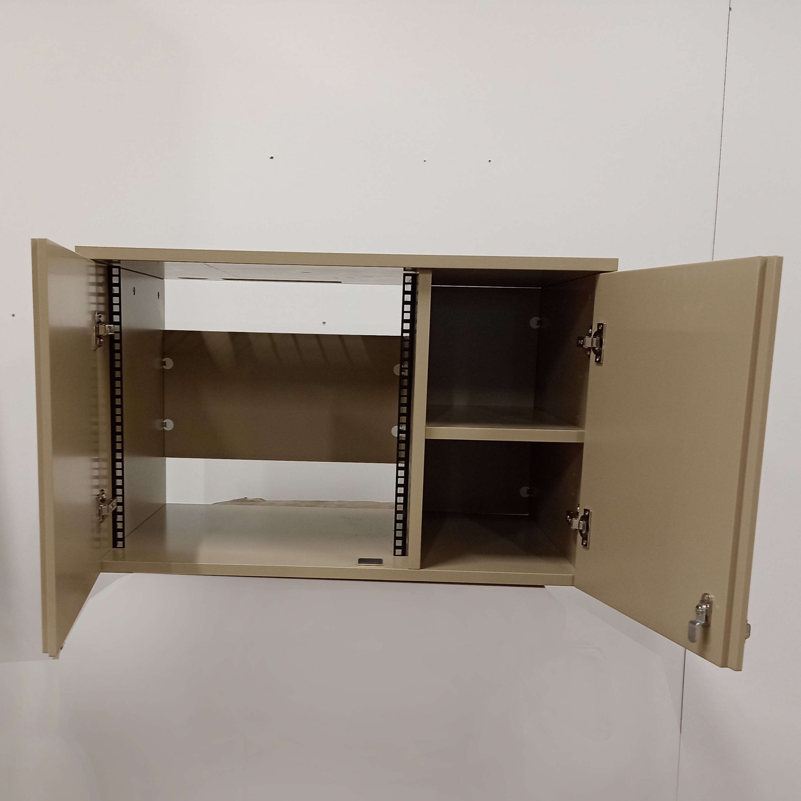 Teknikskåp för vägghängning. Vänster del med rackskenor i framkant anpassat för 19″rack. Höger fack med hylla. Ventilationsgaller och kabelgenomföring i taket. Låsta parluckor. Två nycklar ingår. Kan fås målat eller i valfritt träslag på MDF med synlig MDF-kant.